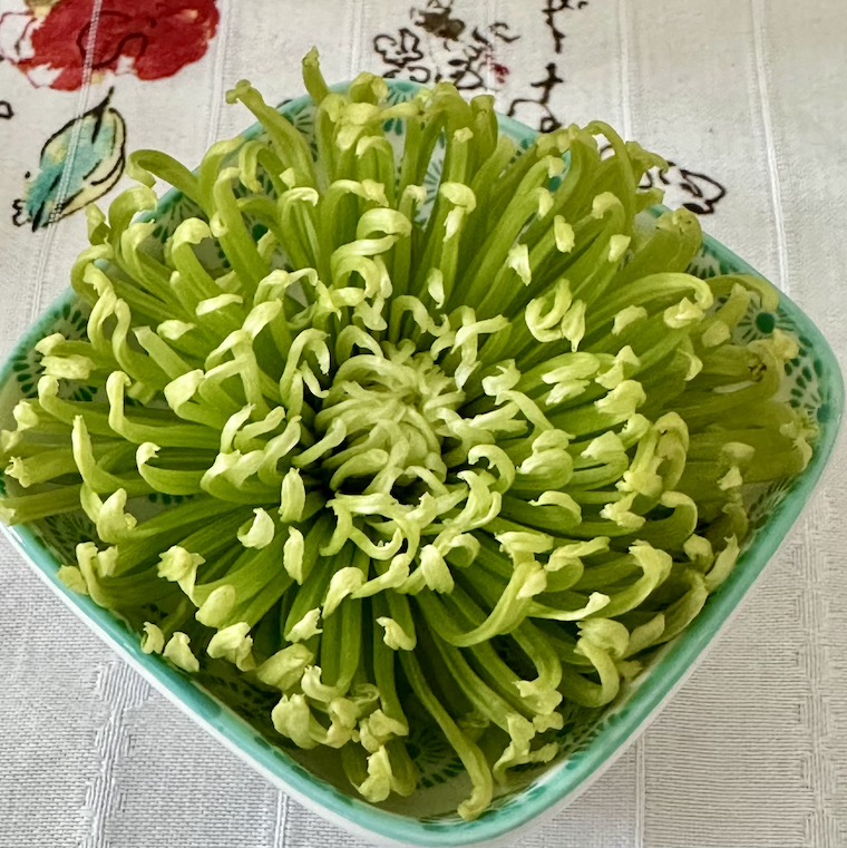 Here, a chrysanthemum flower – architectural stunner on its own, even bereft of stem – forms its own little bouquet, and at a perfect scope for a dinner party where no one wants to talk over or around a pesky arrangement.