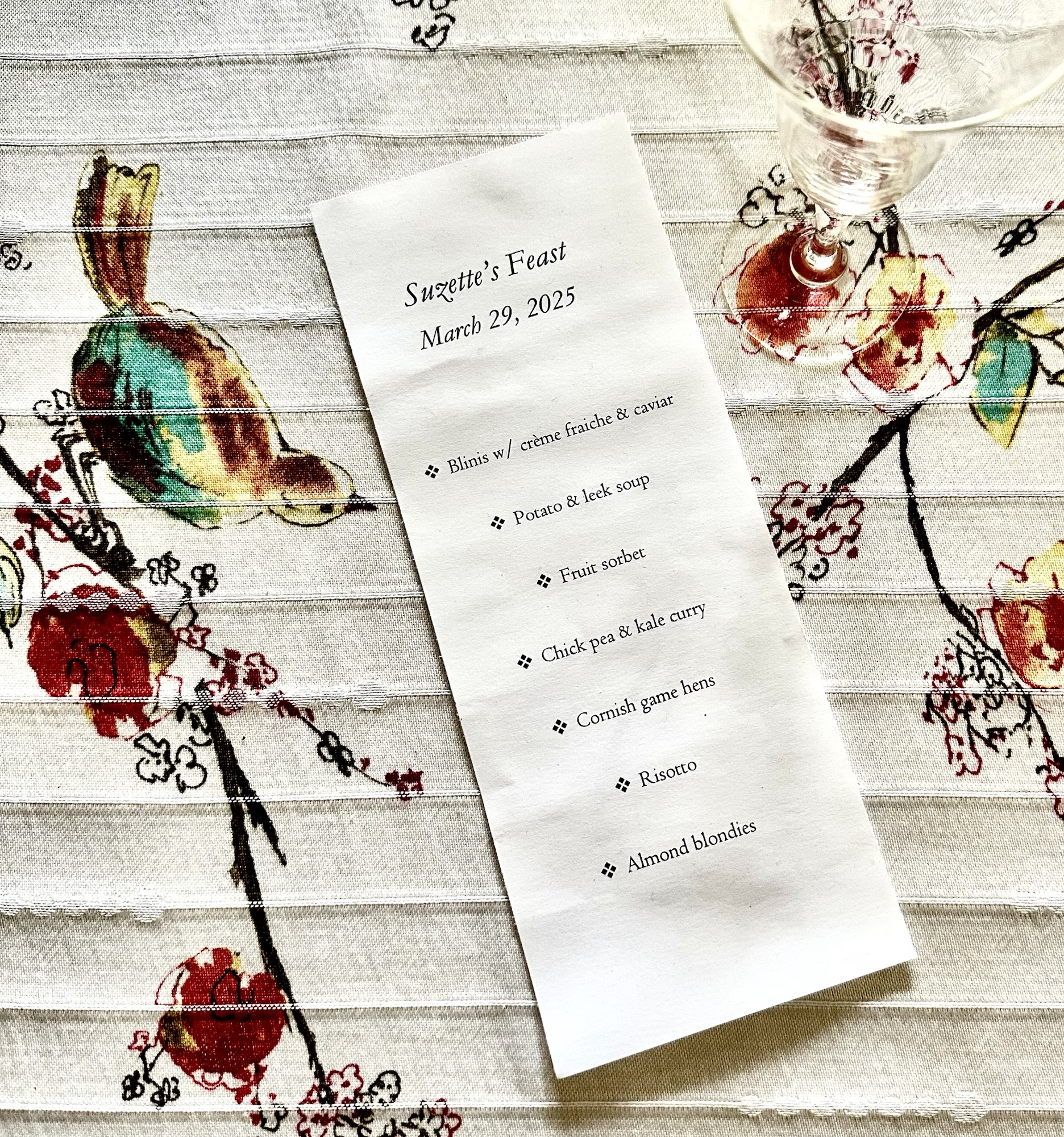 Mom and Milo helped with the dish-turnover, and Andy helped with the dishwasher-loading, and by the time the evening came to a close, our appetites for comfort and culinary decency had been satiated. Suzette’s Feast had been a success.
