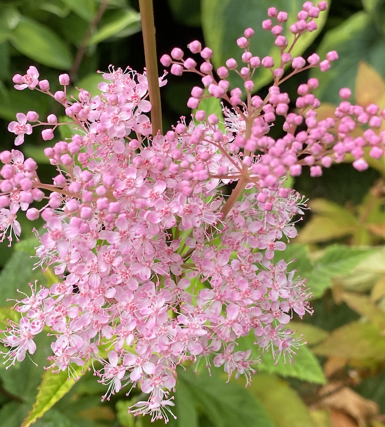 This lovely pink/peach-hued cloud of a flower cluster belongs to the Filipendula. More commonly known as the Queen of the Prairie, she holds these flower umbrels high above the prairie, upwards of five feet tall. She attains such size and stature when afforded a wet and consistently moist piece of land.