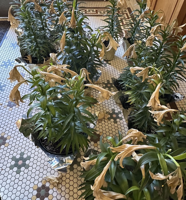 On lunch, I walk up to the church where I used to go when Dad was dying. It wasn’t a moment of sadness, more of reflection, and oddly enough, comfort. The Easter celebrations had been over for a while – a collection of dead Easter lilies sat sadly in the entryway – no scent or fragrance emitting from the dessiccated blooms, but the foliage was still green. I hoped someone would plant them in a garden and give them a chance to come back next spring. Unlikely, but while they stood in the hall I reserved hope.