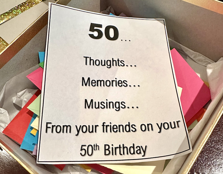 For my 50th birthday, Sherri and Skip gave me what may very well be the best gift of the year, and I don’t mean the pair of precious Hermes fragrances that was part of their offering – it was a box of 50 little colorful notecards in individual envelopes, each with a memory or musing or moment written on it that went back over the past twenty years of shared friendship and office adventures. To say that I was touched, this year and this birthday especially, is an understatement, and I can’t thank them enough for such a meaningful and poignant gift.