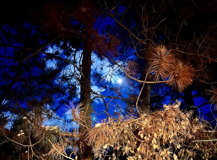 Tonight’s super moon is the last one of the year. Banally christened the ‘Cold Moon’ for obvious reasons (it’s fucking cold, duh), this one is also said to inspire motions of reflection, renewal and closure. Coming at the end of the year, this seems a safe bet, along with all the other ruckus a full super moon typically raises. At the time of this writing, the forecast looks to be rather gray and unconducive to viewing, but there may be a clearing later in the evening (post-script note: the sky has cleared, so I took some new pics for this post). Temperatures, however, may not be inviting enough for a naked full moon ritual, but when you’ve done that once you don’t really need to do it again.