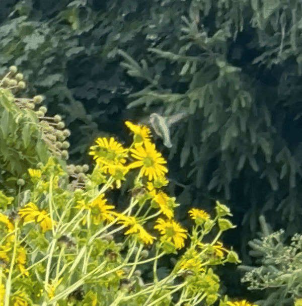 The garden has been quietly busy of late, with our cup plants and butterfly bush providing fertile feeding and pollinating ground for the birds and bees and a hummingbird as seen here. Both continue in their long blooming period, allowing for enjoyment by these visitors that will last through the start of winter. The bees and insects will depart first for the season, then the hummingbirds will go – only the finches will keep coming back into the slumber time.