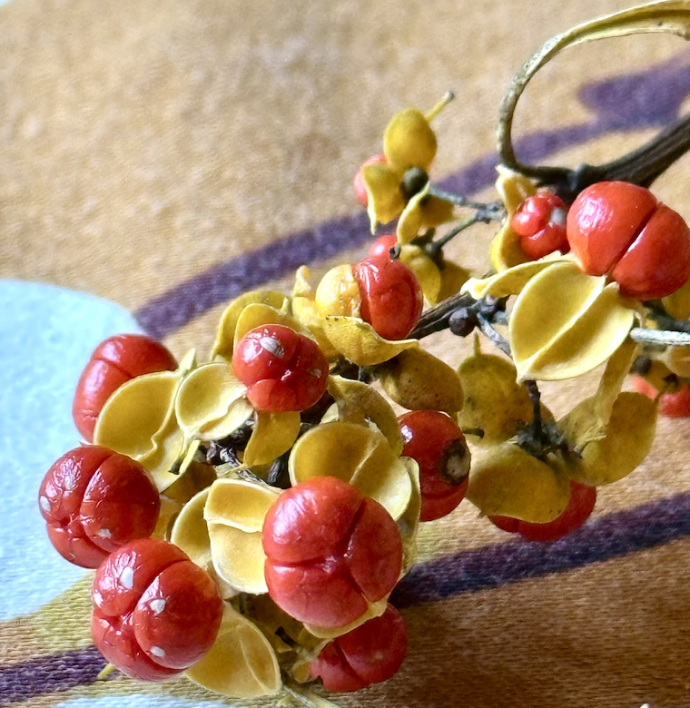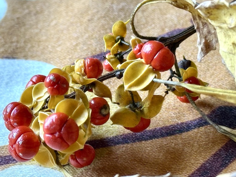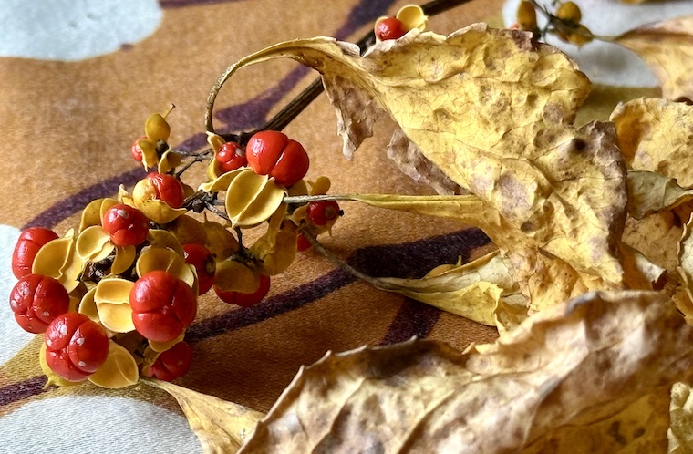 When dealing with an invasive vine like bittersweet, show no mercy. At this point, there is more of this plant than anyone wants, so if you want to harvest its fruit for decoration, have at it. The trick and key is to pick your stems while the berries are golden but fully intact and not yet open – once cut, they will open up fully indoors. If you pick them after they’ve opened, and already sowing their bright orange guts, it’s too late, and they will shed all their golden shells everywhere, making an annoying mess.