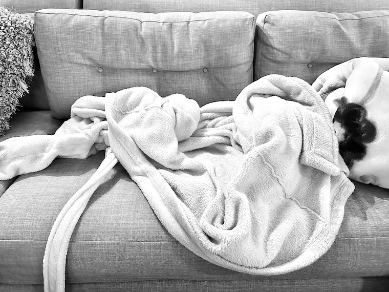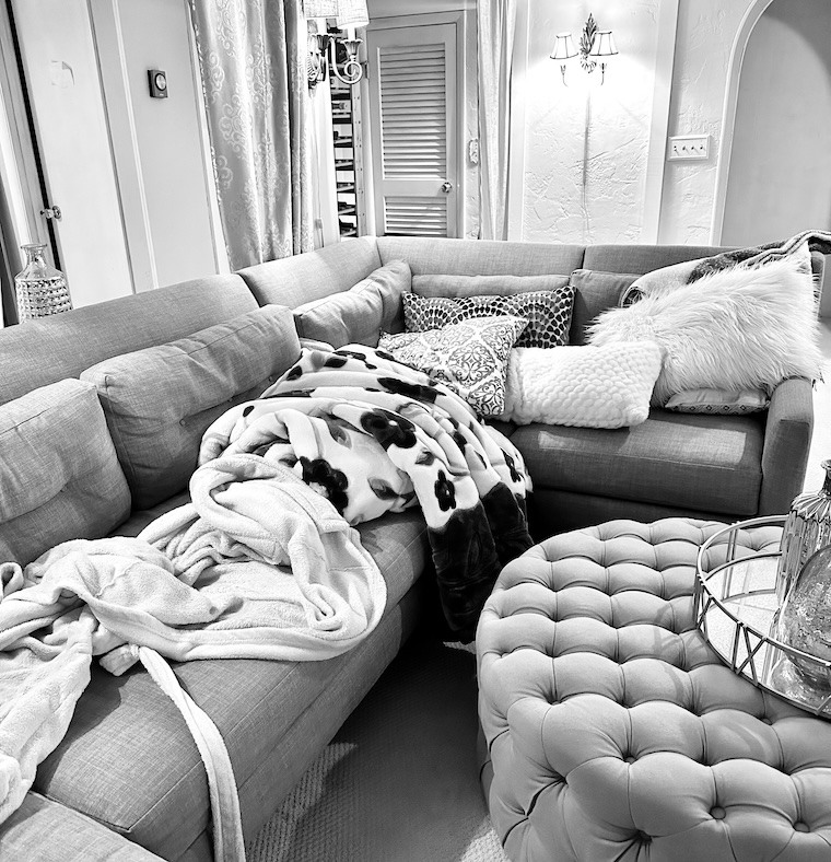 In the midst of whatever flu-type thing I’ve had this past week, the cellar sofa is a mess of pillows and blankets and discarded robes. One moment I would be chilled – shaking and shivering and piling on a robe and blankets and cranking the fireplace – and the next I would be overheating and sweating like I was back in menopause. Oh how the jokes come when you’re sick and nothing seems funny.