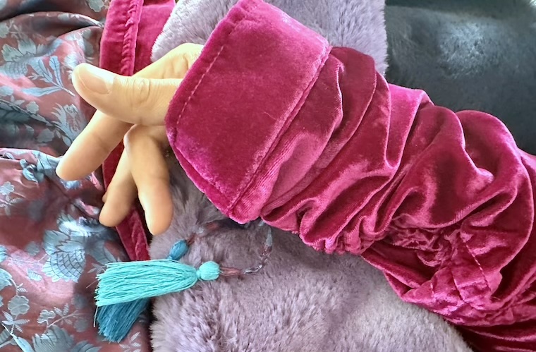 The elements are all present: the velvet rose of his robe, slightly ruched at the sleeve – the ring of colorful jewels, just slightly out of focus – the way his fingers idly roam about some patch of dyed faux fur – and the fragrance of oud, alternately off-putting and intoxicating, the most compelling way to wear a fragrance.