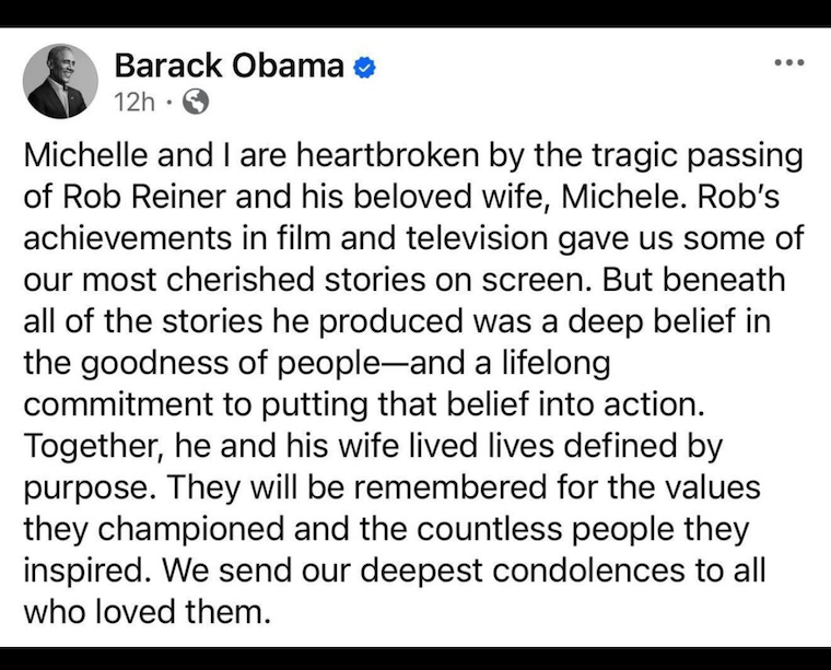 His latest post on Rob Reiner is just confirmation of his deplorable views. For those who want to employ the ‘both sides’ mentality (or, how the news has ruined itself) let’s take a comparative look at two takes on this. Here is President Barack Obama’s message, followed by Trump’s. I know what side I’m on, and it’s the side I’ve always been on: the side of basic human decency.