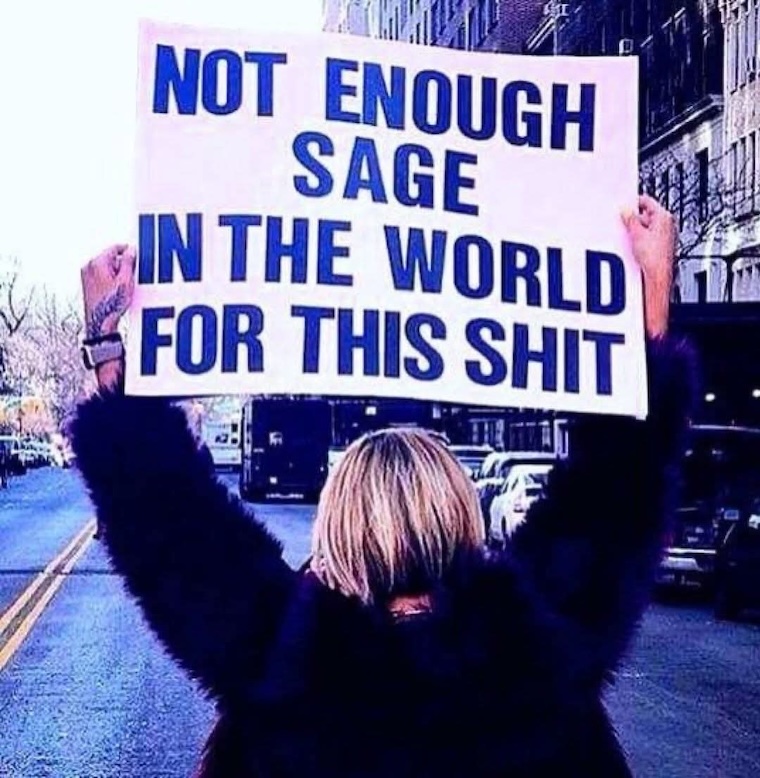 Andy and I are fans of the practice of smudging, but when I saw this meme online the other day I smiled because the current state of the world is going to take more than a collective smudging to set right. I’m not sure it can be set right at this point, something I predicted years ago, and selfishly I’m grateful that we don’t have any children of our own to leave behind in such a place.
