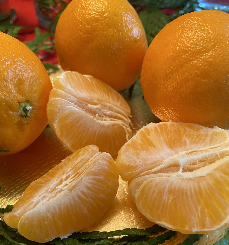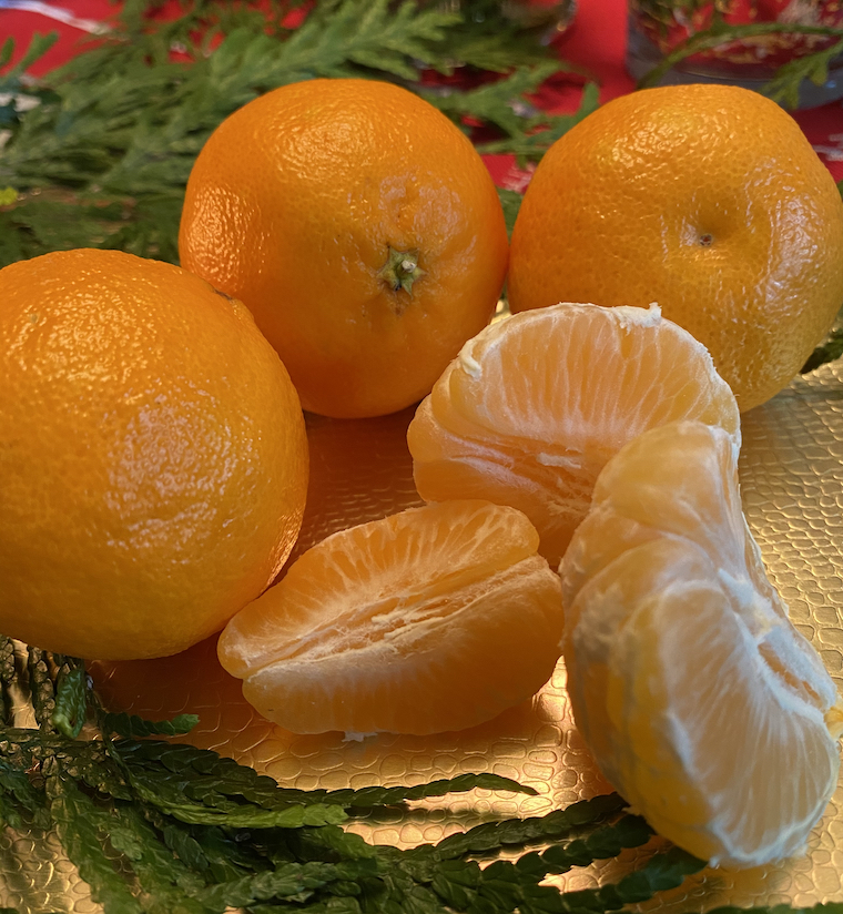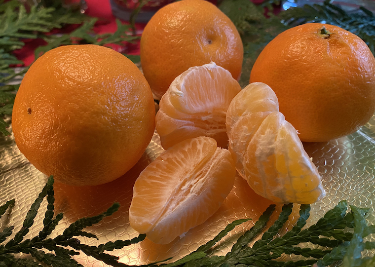 That happy correlation between Christmas and citrus was recalled the other day when Suzie delivered these mandarins – gloriously seed-free, and this season’s first fruit arrival (aside from a couple of grapefruits that my Mom gave us last week). They are as bright and cheery in the mouth as they are on the plate. December is here, Christmas is coming!