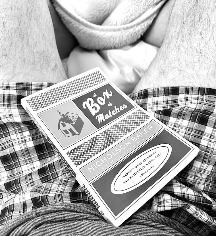 Each chapter begins with the narrator rising very early in the morning and lighting a fire to start his day. ‘A Box of Matches’ by Nicholson Baker is my current book, and I’ve been taking my time getting through it because it’s that leisurely and enjoyable. Baker is the author of one of my favorite teen-reads, ‘Vox’, which is actually quite a sexually-adventuresome adult novel, but I’ve always been more mature than one would believe. In high school, I’d stay up late at night, a single reading lamp lighting the book and surrounding bed on which I laid, and I’d imagine the world of words, late-night conversations, and adult maneuvering as I fitfully twisted and turned beneath the covers.